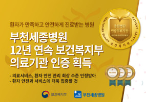 환자가 만족하고 안전하게 진료받는 병원으로 인정받다! 부천세종병원, 3주기 연속 보건복지부 의료기관 인증 획…